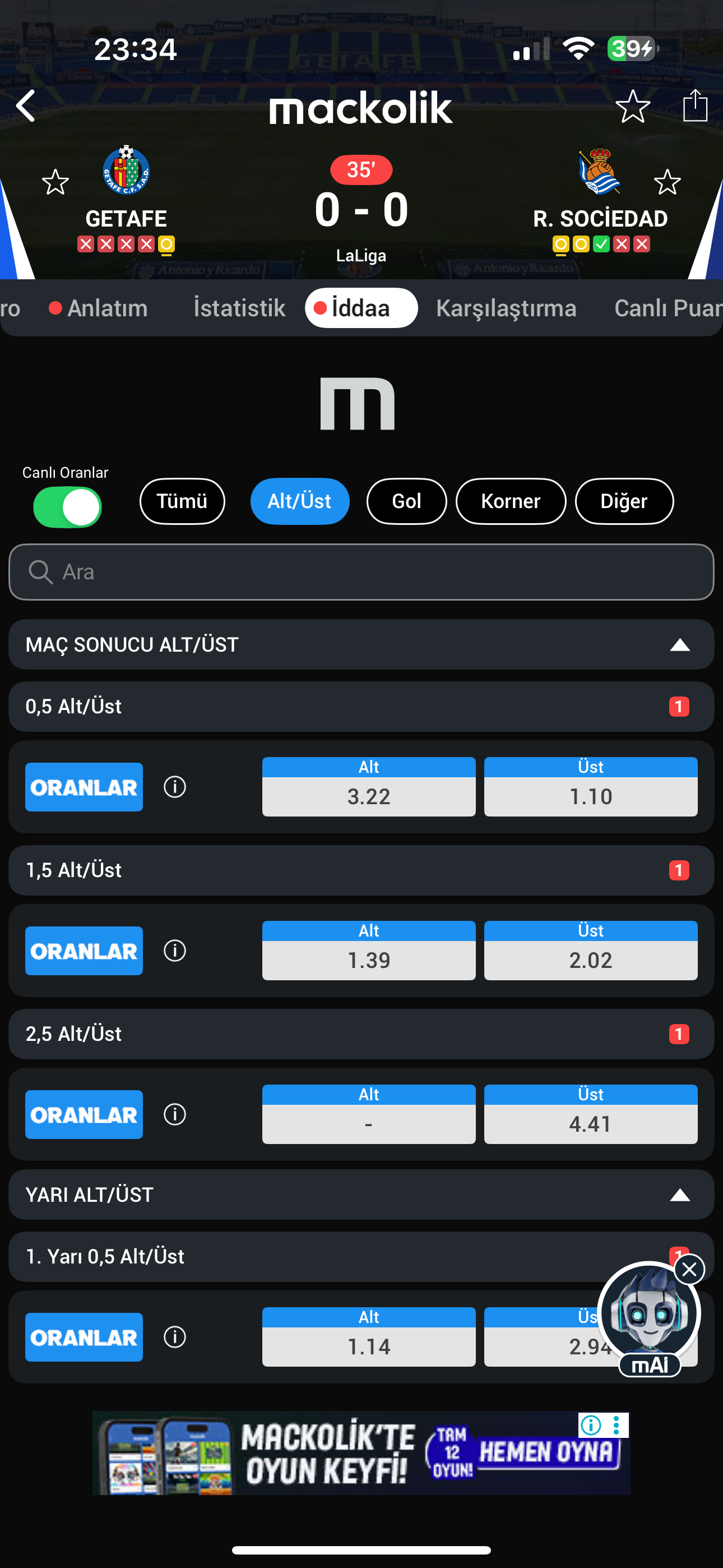 Getafe maçı toplam 1.5 üst canlı